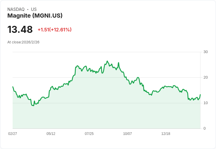 Magnite Inc.(NASDAQ: MGNI)在週四的交易中表現亮眼,股價上漲12.61%,收於每股13.48美元,連續第三天攀升。這一增長主要受益於其出色的財報以及宣佈將進行為期兩年的2億美元股票回購計畫。