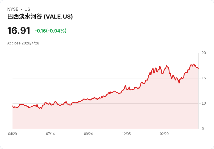 淡水河谷(Vale)於最新財報中公佈2026年第一季GAAP每股盈餘為0.44美元,較市場預期低了0.07美元;營收為92.6億美元,年增約14%,但較預期少了約2.3億美元。財報發布後盤後股價下挫約1.5%,投資者短期情緒轉向謹慎。