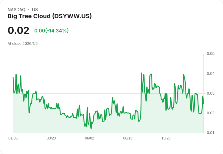 大樹雲端控股有限公司(DSY)於週一公告,收到來自納斯達克的兩份通知,指出其不符合最低市場價值要求。根據交易所資料,公司上市證券的市場價值已連續30個工作日低於5000萬美元,而公開持有股份的市場價值則低於1500萬美元。這些情況使得公司面臨潛在的退市風險,但納斯達克已給予其180天的合規期,直到2026年6月29日,以便重新達到相關要求。目前,此通知並不會立即影響該公司的股票上市或交易情況。值得注意的是,DSYWW的收盤價格下跌了14.33%,目前為每股0.0245美元。此事件引發投資者對大樹雲端未來表現的關注,專家建議密切觀察其後續動作及市場反應。