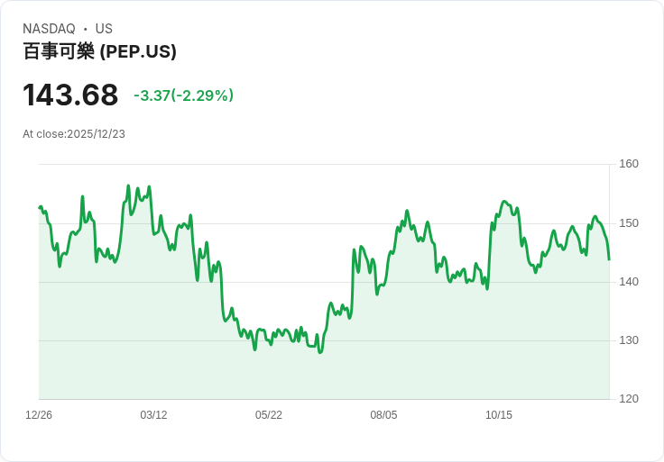 在經歷了連續六天的跌勢後,百事可樂(PepsiCo, PEP)於週三以143.74美元收盤,僅微幅變化。這段期間內,該公司股票累計下跌約4.45%,並在過去一個月內下降約2%。根據最新資料,PEP週二收盤報143.68美元,下跌2.29%。