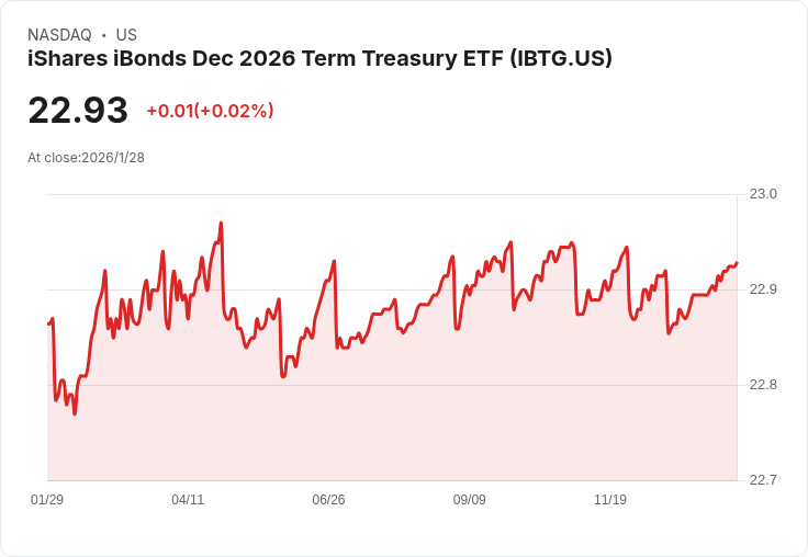 根據2026年1月15日的SEC檔案,Trinity Wealth Management, LLC 在iShares Trust - iShares iBonds Dec 2026 Term Treasury ETF(NASDAQ:IBTG)中增加了222,998股的持倉,估計交易價值約為510萬美元。這次增持使得IBTG佔基金13F AUM的2.18%。該ETF專注於2026年到期的美國國債,提供可預測的收入和本金回報,適合希望獲得低信用風險的投資者。