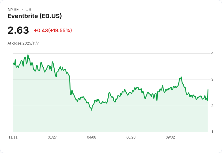 Eventbrite 最新財報超越預期,股價上漲至2.63美元。分析師調整營收與虧損預測,對公司長期展望持保留態度。