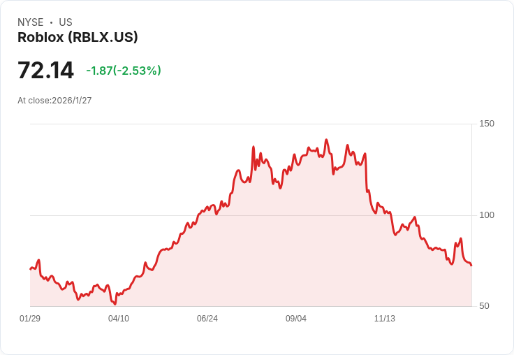 在經歷了近9%的下跌後,Roblox(RBLX)股票於週三下午出現回升,漲幅達4.21%,報75.18美元。該公司的股價自1月20日起開始走低,當時收盤價為78.84美元,並在週二以72.14美元收尾。年初至今,其股價已下滑9.43%,相較之下,整體市場僅微幅上揚約2%。根據分析機構的評級,Roblox獲得持平評分,總分為2.69(滿分5)。儘管其增長評級為A,但因估值和盈利能力表現不佳而受到拖累。
