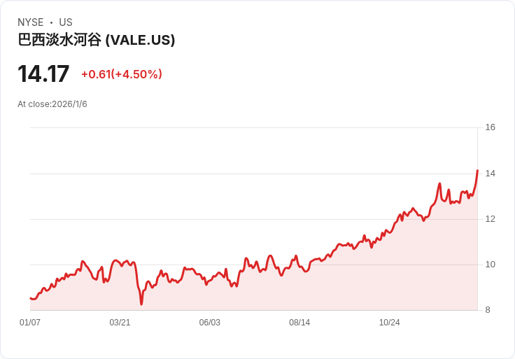 在最新交易日中,全球鐵礦石和鎳生產商Vale(NYSE:VALE)股價收於14.17美元,上漲了4.50%。自2002年上市以來,Vale的股價已增長530%。當日交易量達到5720萬股,超出三個月平均水平75%。此波上漲得益於多家機構投資者的新增持倉,以及對2025年股票回報的樂觀評估。