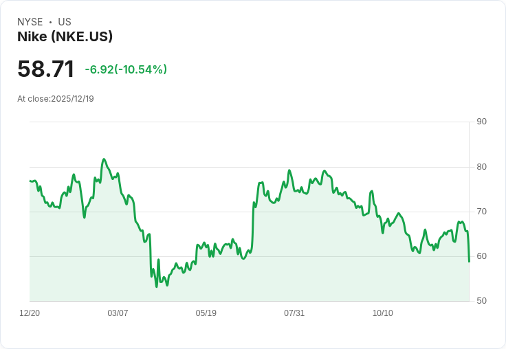 尼克(Nike, NYSE:NKE)的股價在上週五收盤時下跌至58.7美元,跌幅達10.5%。這一劇烈波動源於該公司最新財報所揭露的負面訊息,包括中國市場銷售下降17%及毛利率減少300個基點。儘管銷售小幅增長1%,每股盈餘卻驟降32%,未能滿足投資者預期,造成股市反應強烈。