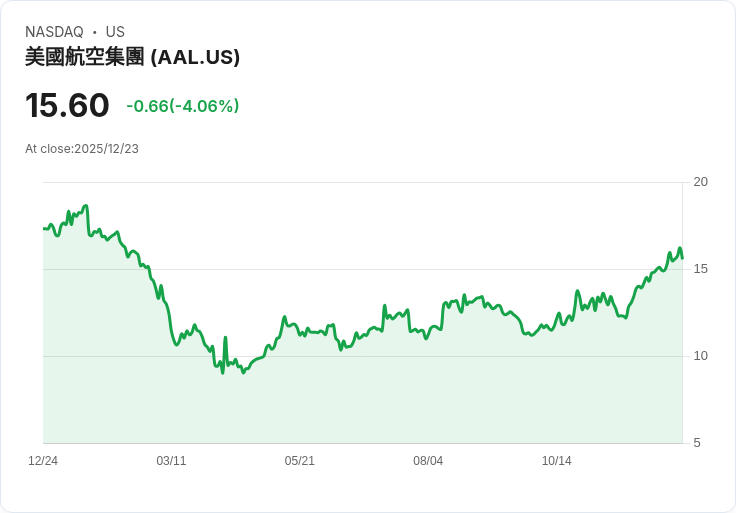 美國航空集團(NASDAQ:AAL)於本週二的交易中以每股15.60美元收盤,下跌4.06%。自2005年上市以來,美國航空股價已下跌19%。當日成交量達6780萬股,超過三個月平均水平9%。