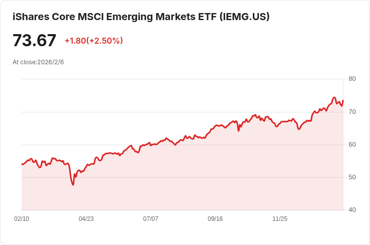 投資者在尋找多元化的股票市場時,iShares Core MSCI Emerging Markets ETF (IEMG) 與 SPDR Portfolio MSCI Global Stock Market ETF (SPGM) 是兩個值得關注的選擇。IEMG專注於新興市場,而SPGM則涵蓋全球股市,包括美國及其他已開發市場。根據資料顯示,截至2026年2月7日,IEMG的年度回報率為37.83%,明顯高於SPGM的21.47%。此外,IEMG的股息收益率也較高,達到2.51%。