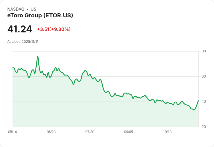 eToro集團近期股價回升,日內上漲9%,一週累計漲幅達20%。儘管年初至今仍下跌38%,市場對其估值的看法引發熱議。