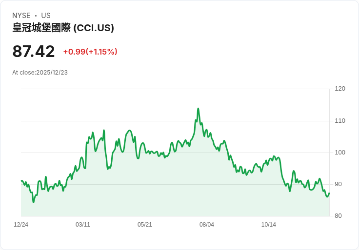 新聞:皇冠城堡(Crown Castle, CCI)近幾個月股價悄然下滑,目前約為87.42美元,儘管其塔樓和光纖業務對美國無線網絡至關重要。這一現象引發了投資者對於成長及利率風險的重新評估,使得市場情緒有所減弱。