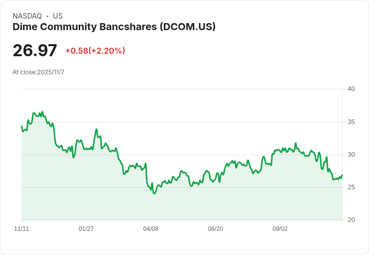 新聞:Dime Community Bancshares(DCOM)最新的第三季財報引起了廣泛關注,儘管每股盈餘未達分析師預期,但營收卻超過預測。該公司目前股價為26.97美元,當日上漲2.2%,但30天內回報仍下滑7%。近期的高層變動和貨架註冊活動令市場情緒複雜,加之過去一年總股東回報率為-16.43%,使得投資者對公司的前景感到擔憂。不過,從長期來看,五年內的總回報仍然增長近58%。