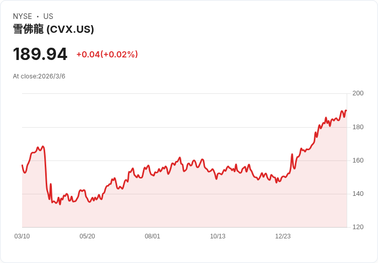 作為全球最大石油公司之一,Chevron (CVX) 在這樣的背景下,正面臨重要時刻。該公司已連續39年提高股息,其強健的資產負債表與穩定的現金流使其能夠在市場波動中維持分紅政策。在2025年第四季度報告中,Chevron宣佈季度股息增加4%。根據最新資料,Chevron的年度股息約為7.12美元,每股股息收益率約為3.76%。