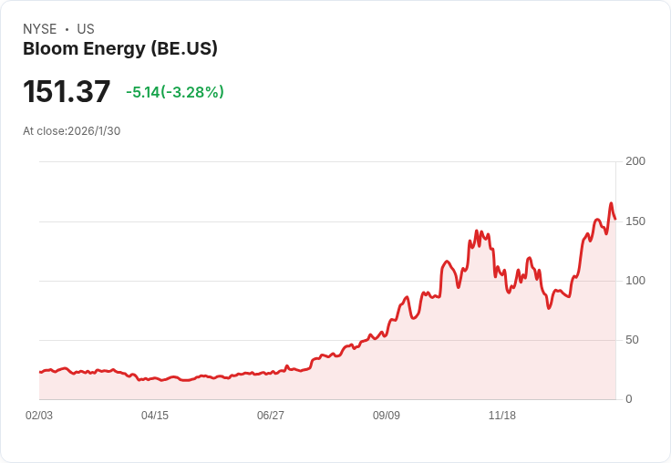 Bloom Energy Corporation(NYSE:BE)的股價在2026年1月22日至29日之間上漲了7.47%,成為本週表現最佳的能源股票之一。該公司專注於設計、製造及安裝固態氧化物燃料電池系統,提供美國及國際市場的現場發電解決方案。Bloom的能量伺服器能夠將天然氣、生物氣和氫等燃料轉換為無燃燒電力。