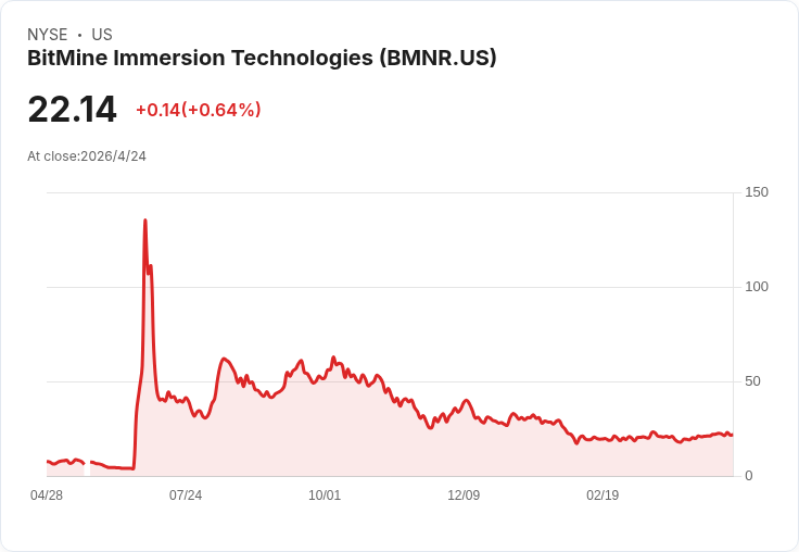 公司背景與公開資料 BMNR自稱為以區塊鏈技術與以太坊相關資產管理為主的公司。截至2025年4月20日,市場報價約為每股22.53美元,公開資料顯示其市盈率極低。公司持有超過約4.4百萬枚以太幣(ETH),並以累積與質押(staking)策略獲得協定層面的報酬。管理層強調擴充質押基礎設施與增持ETH是其成長路徑。