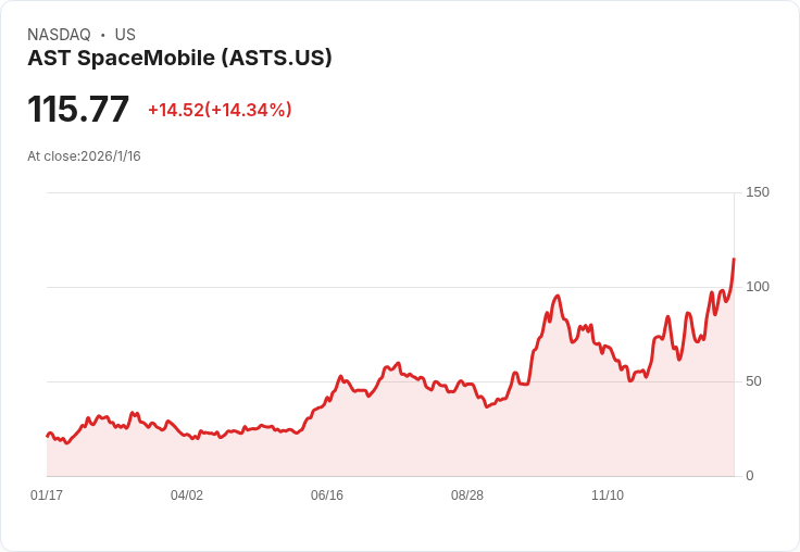 AST SpaceMobile因獲得美國導彈防禦局的主要合約,股價在交易中一度攀升至120.80美元,最終收盤上漲14.34%。