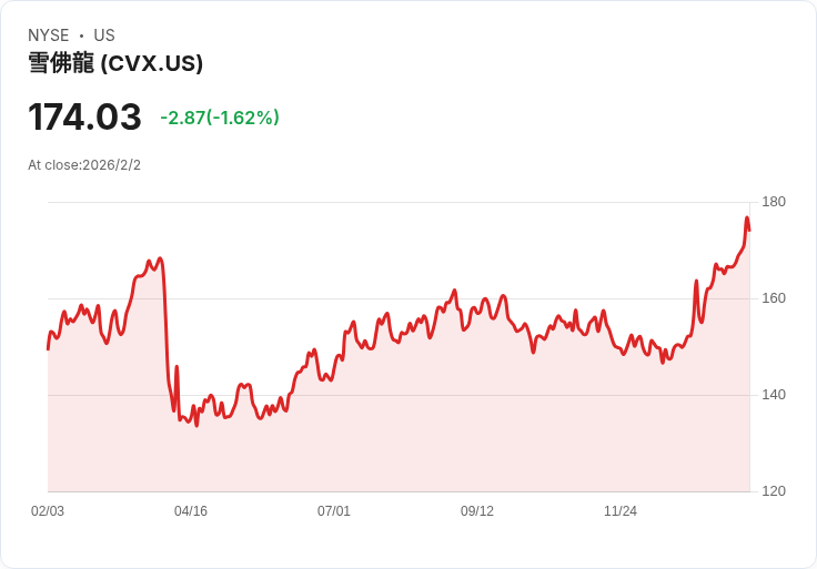 雪佛龍(Chevron, CVX)周一股價下滑1.5%,報174.19美元,終止了連續六個交易日的上漲趨勢。這段期間內,雪佛龍累計上漲6.1%,並在過去一個月內增長15%。雖然該公司第四季調整後的收益和收入較去年下降,但仍超出華爾街預期。