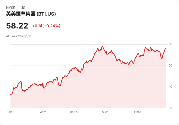 英美煙草(BTI)近日表現亮眼,股價於週五收盤時上漲0.24%,達到58.22美元,自1月8日以來已累積近8%的增幅,顯示出強勁的市場反應。根據過去一年的資料,BTI的漲幅超過63%,遠超標準普爾500指數的16.72%。