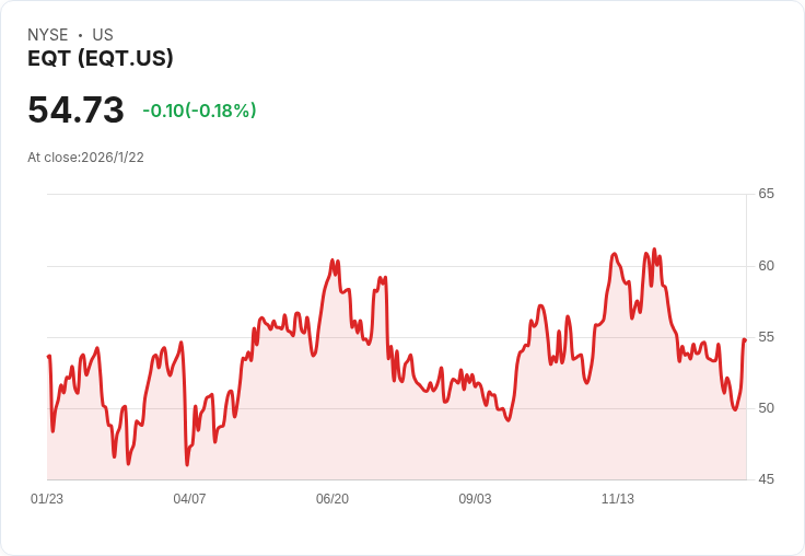 近期,美國天然氣期貨因極端天氣影響而大幅上漲,使得天然氣生產商成為市場焦點,其中EQT(EQT)尤為受到關注。根據最新資料,EQT的股價在過去七天內回升9.64%,五年總股東回報率更是高達254.37%。目前EQT的交易價格為54.73美元,與分析師預測的公平價值64.00美元相比,顯示出約43%的內在折扣。