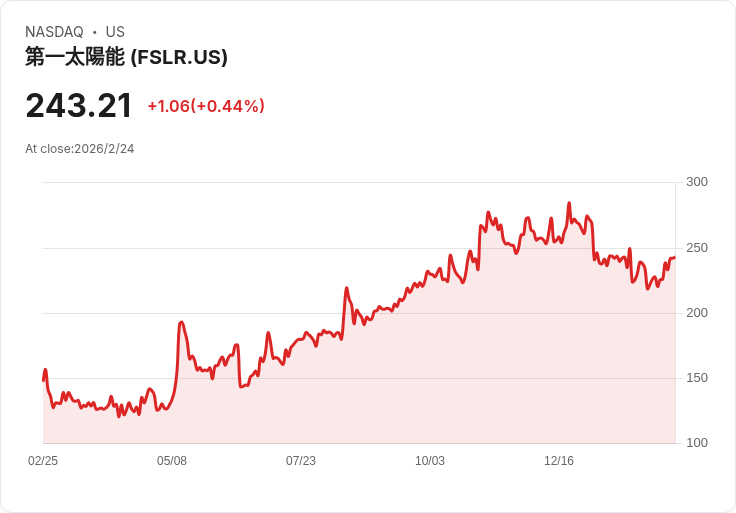 美國太陽能製造商First Solar(FSLR)在最新財報中顯示,儘管第四季度的獲利和收入均有所增長,但仍未滿足市場的期待。該公司宣佈,其Q4 GAAP獲利為5.209億美元,每股收益為4.84美元,相較去年同期的3.931億美元和每股3.65美元有明顯提升,且收入同比增長11%至16.8億美元。然而,First Solar對2026年的全年營收預測僅為49億至52億美元,這一數字不僅低於2025年的52億美元,也遠低於華爾街分析師共識的61.6億美元。
