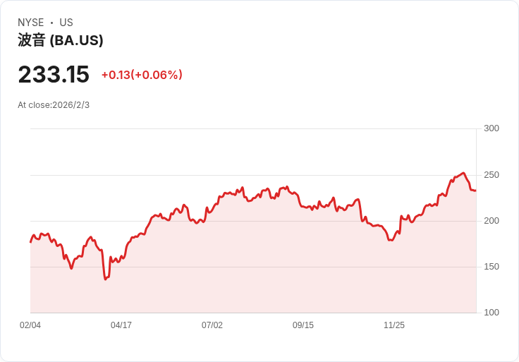 波音(BA)股票在經過六天的連續下跌後,終於迎來小幅回升,週二收盤上漲0.06%,報233.15美元。自1月26日起,該股開始走低,當日下跌1.48%;隨後在1月29日更是大幅下挫3.13%。截至2月2日,股價累計下跌超過6%。