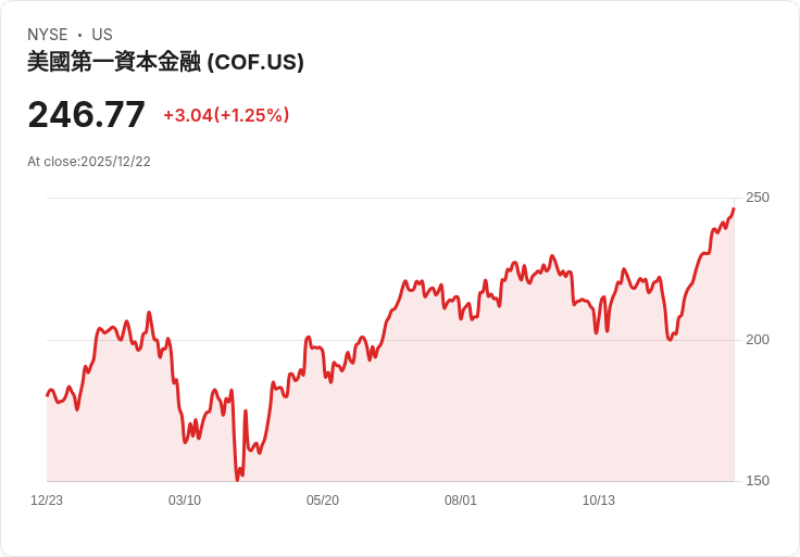 根據報告,資本一的股價在過去一個月內上漲了15.07%,並在過去52週內增值35.50%。截至2025年12月22日,資本一的收盤價格為每股246.77美元,市值達到1578.14億美元。RGA提到,他們最近將資本一納入投資組合,這是基於對其未來發展的信心。