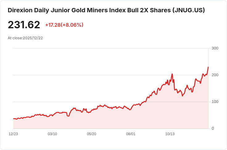 投資者注意!Direxion每日小型金礦牛市2倍ETF(JNUG)日前宣佈其最新的季度分配計劃。根據公告,每位持有該基金的股東將獲得每股$0.071的現金分配,此次分配將於12月31日發放,而股東必須在12月23日之前完成登記。此外,對於想瞭解這一槓桿ETF結構及適用性的投資者,市場上也提供了相關資料和分析,幫助他們評估未來的投資潛力。隨著金礦行業的不斷變化,JNUG的表現仍然引起廣泛關注,尤其是在2026年的展望中。面對不確定性,投資者應謹慎考量,並把握機會以期獲取更高回報。