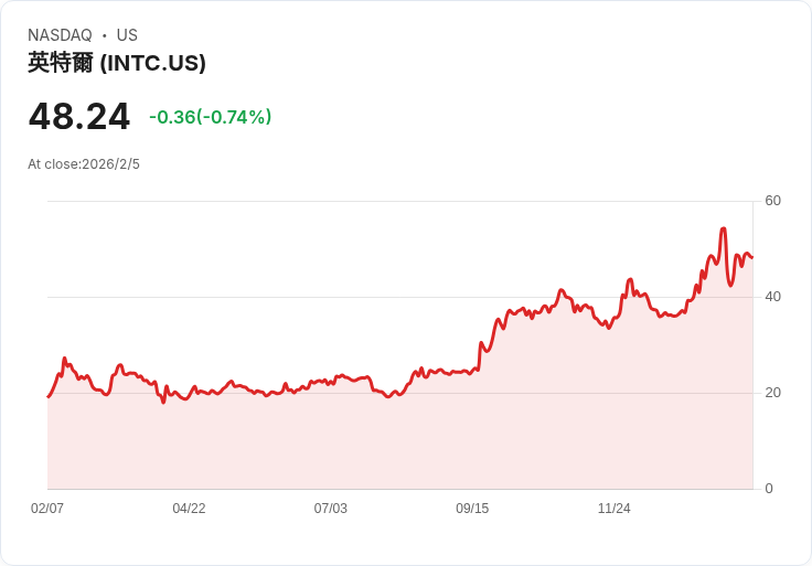 今天,英特爾(Intel)股價在美國股市中大幅上揚,至上午11:52時上漲5.5%。儘管自1月22日財報發布後股價有所回落,但近期已逐步恢復,接近多年的高點。此次反彈主要受到整個AI相關半導體行業向上的推動,尤其是亞馬遜宣佈2026年將投入2000億美元進行資本開支。