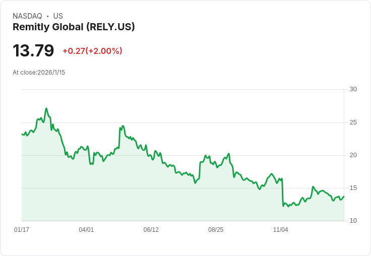新聞:Remitly Global, Inc.(NASDAQ: RELY)近日在市場中引發關注。儘管Wolfe Research的分析師Darrin Peller於1月8日將該股目標價從18美元下調至16美元,但仍維持買入評級,顯示出對其前景的信心。根據最新資料,這一調整意味著相較目前價格仍有19.4%的上漲潛力。類似地,Goldman Sachs的Will Nance也在1月6日將目標價由19美元下修至17美元,同樣維持買入評級,暗示未來可望達到27%的增幅。