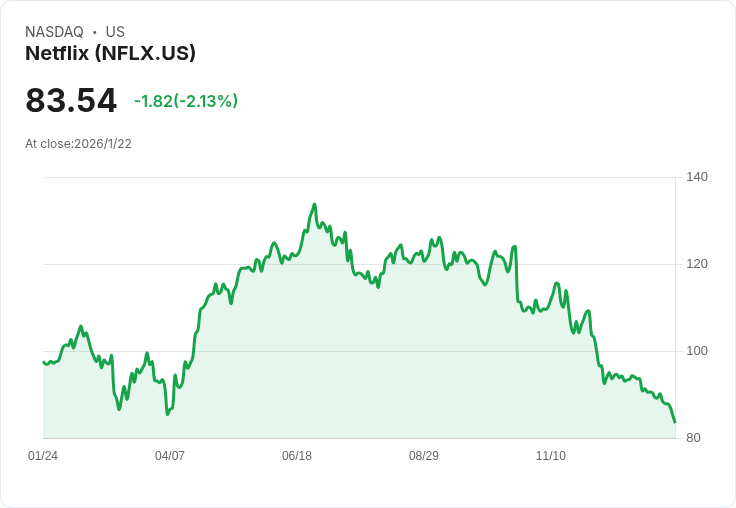 自2026年1月14日以來,Netflix便開始了下行趨勢,本週四收盤時股價報83.54美元,下跌2%。一月份對於Netflix而言並不是理想的月份,僅有三次收紅,而其餘11個交易日均告失利。本週Netflix發布的第四季度財報略微超出預期,但因與Paramount競爭收購華納兄弟探索(Warner Bros. Discovery)的新聞而受到市場關注,導致股價大幅波動。