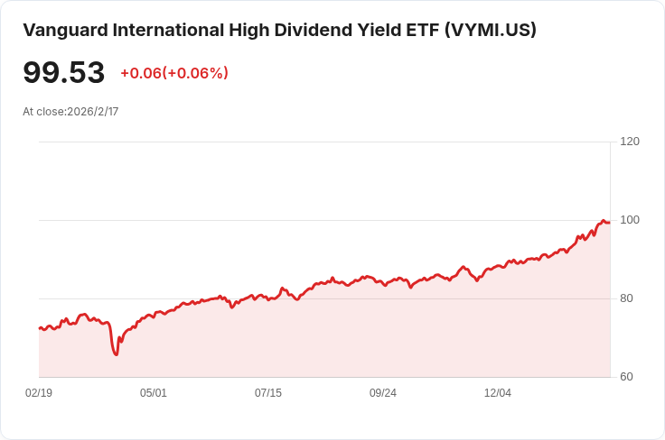 近期,Vanguard國際高股息收益ETF(NASDAQ: VYMI)隨著國際股票勢頭延續而受到關注。該ETF今年迄今上漲9.23%,超越了標普500指數的微幅下跌0.14%。這一ETF擁有182億美元的管理資產,成為最大的國際股息ETF,並且在過去三年中表現優於其美國同類產品。