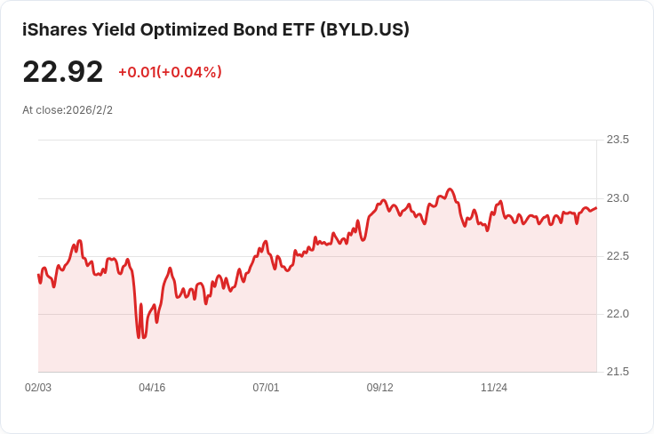 iShares收益最佳化債券ETF(BYLD)宣佈將於2月6日支付每股$0.1036的分配金,30天SEC收益率達5.31%。