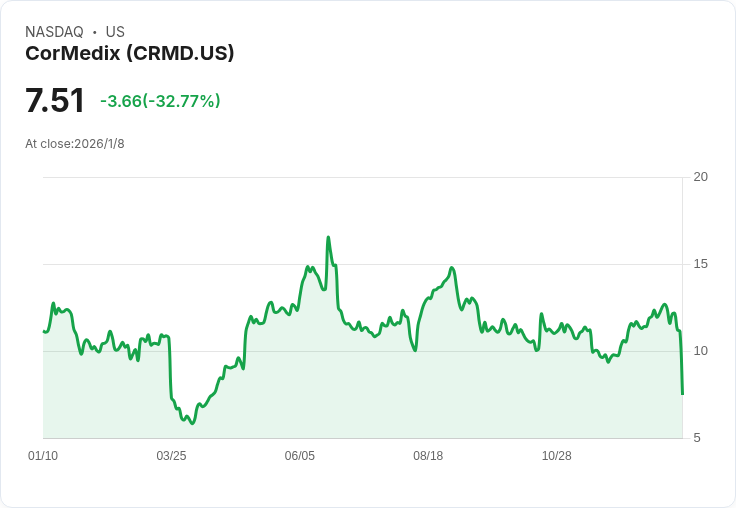 CorMedix宣佈2026年營收預測僅為3億至3.2億美元,遠低於市場共識的4.54億美元,導致股價大幅下滑。