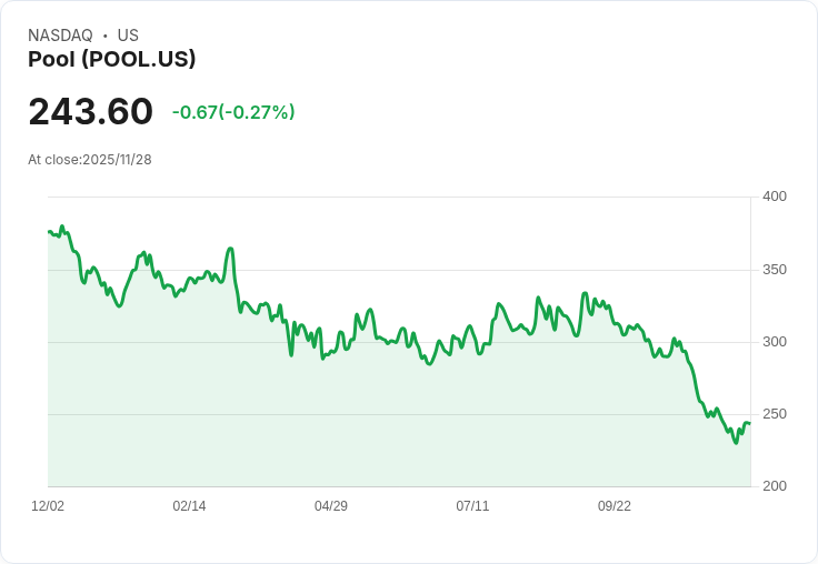 最近,池公司(POOL)的股價面臨挑戰,過去一個月和三個月內均有所回落。該公司的表現吸引了投資者的注意,他們希望瞭解驅動股票近期趨勢的因素。目前,POOL的股價在過去一個月下降了12.12%,年初至今則累計下降26.82%。從更大的角度看,過去一年總股東回報率為-34.34%,這反映出隨著投資者重新評估泳池及戶外生活領域的前景,增長預期正在改變。
