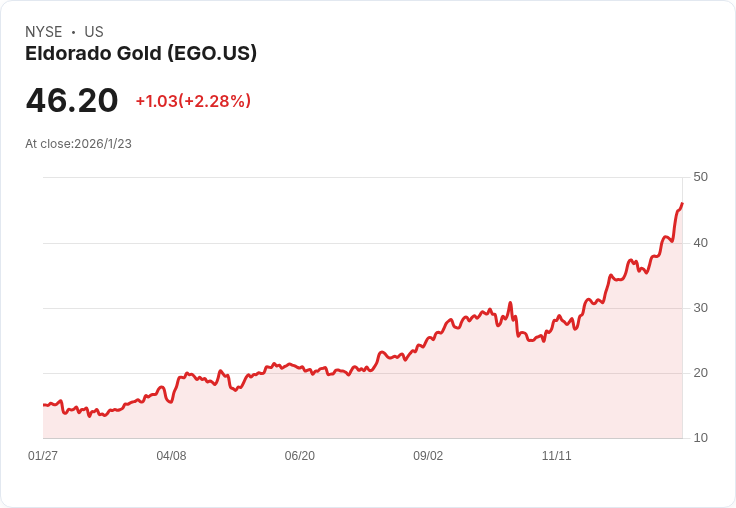 在週一的交易中,埃爾多拉多金礦(EGO)股價上漲6.7%,創下50.67美元的新高。隨著金價突破5,100美元/盎司的歷史新高,蘇格銀行將該公司的評級從「行業表現」提升至「優於大盤」,並將目標價格從33美元調整至59美元。分析師Tanya Jakusconek指出,金銀價格預測顯著提高,使公司前景明朗,尤其是Skouries項目的推進。