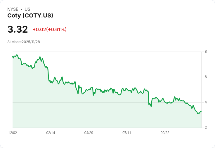 Coty(COTY)的股價在過去幾個月中輕微波動,儘管沒有引人注目的事件影響市場情緒,卻促使投資者重新評估這家公司的表現。根據最新資料,Cotys的年度總回報率為-55.07%,當前股價僅為$3.32,顯示出持續的負面趨勢,而非單一事件造成的劇烈反應。