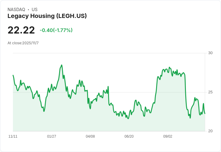 Legacy Housing (LEGH) 在最新發布的第三季財報中,每股盈餘(GAAP EPS)為0.35美元,與市場預期相差0.29美元,而營收則為40.48百萬美元,同比下降8.6%,未能滿足分析師的預測。該季度產品銷售額為2880萬美元,比去年同期減少4.6%。此外,本季交付的地板單元數量為420個,相較於去年的475個持續下降,雖然每單位淨收入有所增加,但整體單位銷售仍顯示出疲弱的趨勢。