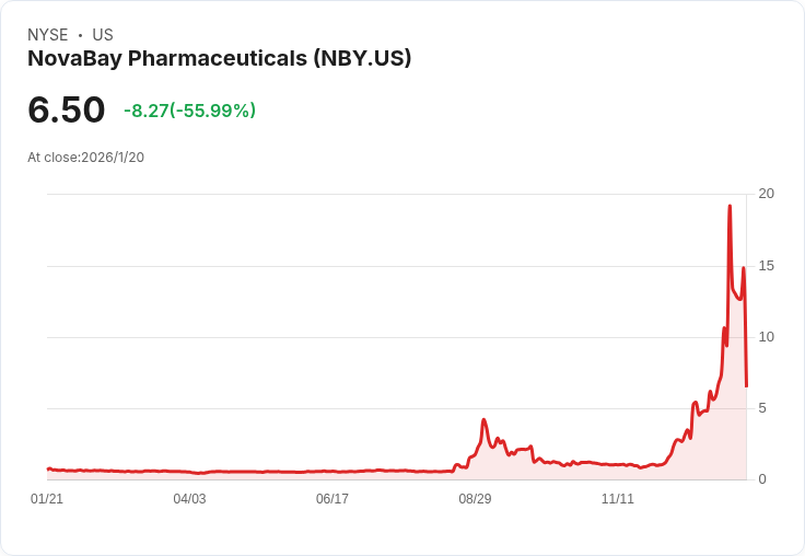 NovaBay Pharmaceuticals(NBY)於週二因宣佈與機構經紀商Virtu Americas簽署一項最高可售1億美元普通股的市場銷售協議,股價驟降約54%。該協議允許NovaBay以每股0.01美元的面值出售其普通股,Virtu則作為銷售代理。根據公司的監管檔案,這些股份將不定期透過Virtu進行銷售。
