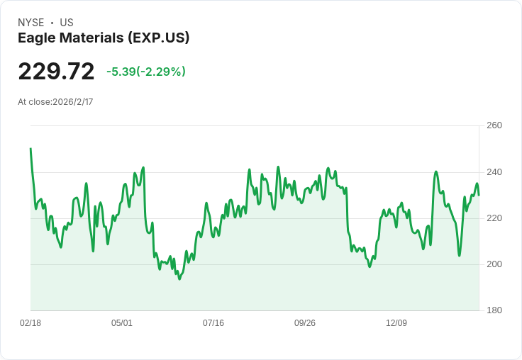 在最新的交易中,Eagle Materials (EXP) 股價下跌1.8%,原因是J.P. Morgan將其評級從中立調整為減持,並將目標價格從230美元下調至215美元。分析師Adrian Huerta指出,隨著住宅需求的低迷,牆板需求的持續疲弱將成為未來幾年的主要挑戰,尤其是在2026年下半年之前,情況不會有明顯改善。