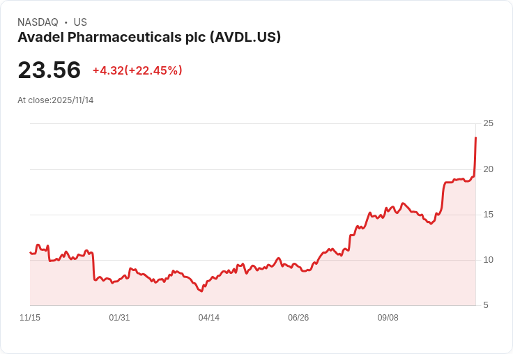 Avadel Pharmaceuticals plc(NASDAQ: AVDL)近日在股票市場上表現搶眼,連續五天上漲,最終以每股23.56美元收盤,較前一日上漲22.45%。這波漲勢主要受到其收到H Lundbeck A/S提出的收購提案影響,此提案被認為優於Alkermes PLC早前的報價。在當日交易中,Avadel的股價一度達到23.57美元的10年來最高點。