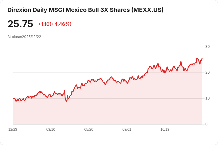 Direxion Daily MSCI Mexico Bull 3X Shares(程式碼:MEXX)近日宣佈將於12月31日向股東發放每股$0.1574的季度分配。該分配金額對於持有股票的投資者來說是一項重要的收益來源,特別是在當前市場波動較大的情況下。根據公告,所有截至12月23日的股東均可獲得此分配,而在同一天也將是除息日。