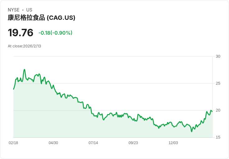 Conagra Brands 在CAGNY會議前重申FY26業績預測,股價微幅上漲至19.79美元,市場對其未來表現持觀望態度。