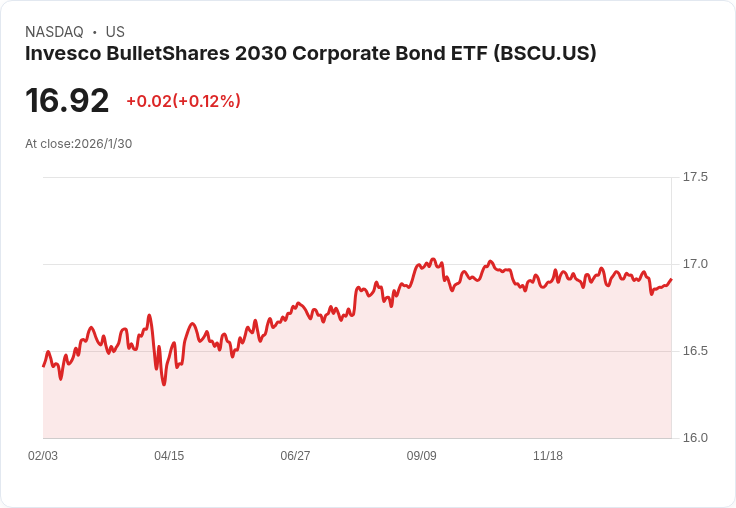 根據證券交易委員會的檔案,BSCU的最新持有價值達到746萬美元,佔該基金報告資產的2.91%。截至1月29日,BSCU的每股價格為16.90美元,較去年上漲3%。該ETF專注於追蹤2030年到期的美國投資級公司債,並採用取樣方法重現指數,以確保流動性和收益的平衡。