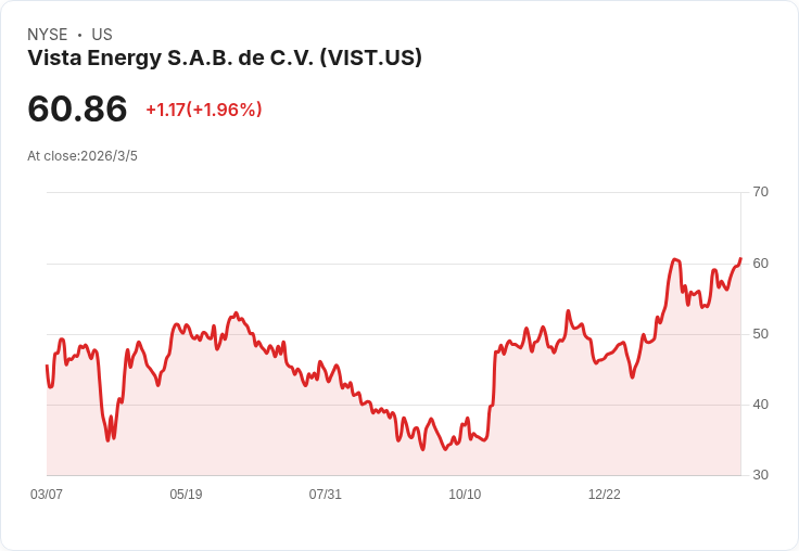摩根士丹利近期對Vista Energy, S.A.B. de C.V.(NYSE:VIST)表現出強烈信心,將其目標價格提高至74美元,並維持「增持」評級。這一調整反映了該行對2025年第四季度結果的重新評估,雖然運營假設變化有限。此次調整主要是為了與布倫特原油前景曲線相匹配,該指數在過去五個交易日內平均上漲6%至9%。