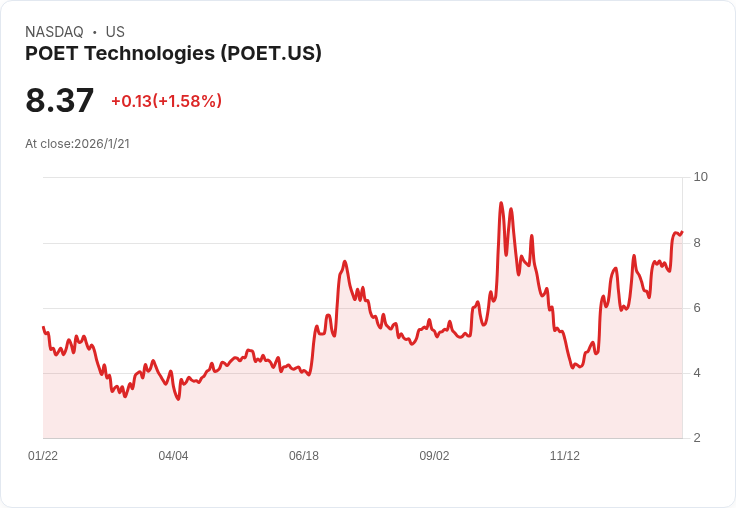 POET Technologies(POET)在週四驚喜宣佈,成功定價1.5億美元的註冊直接發行股份。該公司與機構投資者簽訂了證券購買協議,將出售20,689,656股普通股。此訊息引起市場關注,導致其股價在盤前交易中下滑3.11%,至每股8.11美元。