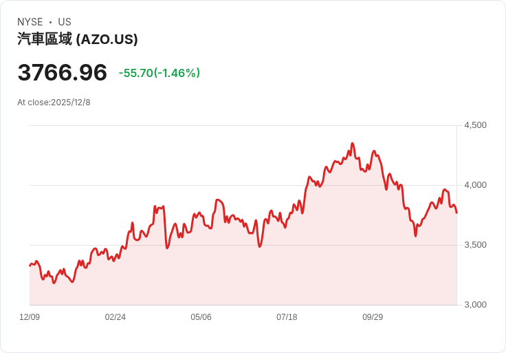 AutoZone Inc. (NYSE:AZO)的股票在週二前市交易中下跌2.4%,原因是該公司發布的第一季財報顯示其獲利未能滿足市場預期。根據報告,截止到2025年11月22日的第一季度,每股盈餘為31.04美元,低於分析師預測的32.87美元。而營收則同比增長8.2%,達到46.3億美元,略低於共識預估的46.4億美元。同店銷售也上升了5.5%,其中美國同店銷售增長4.8%。
