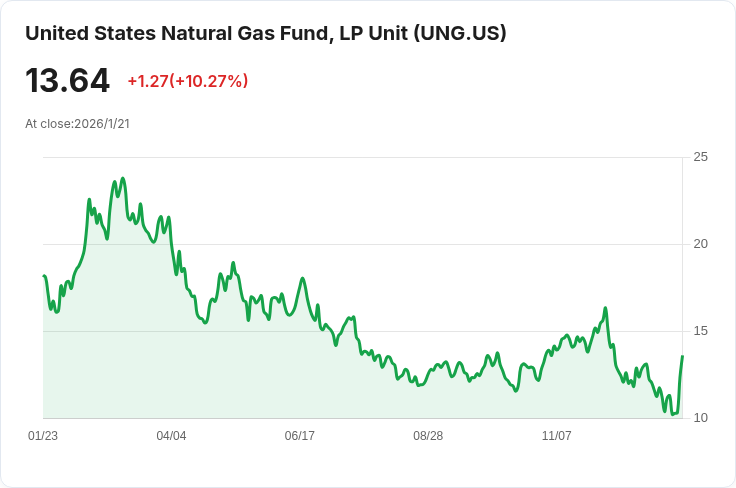 美國天然氣基金(UNG)本週上漲39.8%,目前價格在200日移動平均線附近,但面臨高波動風險。