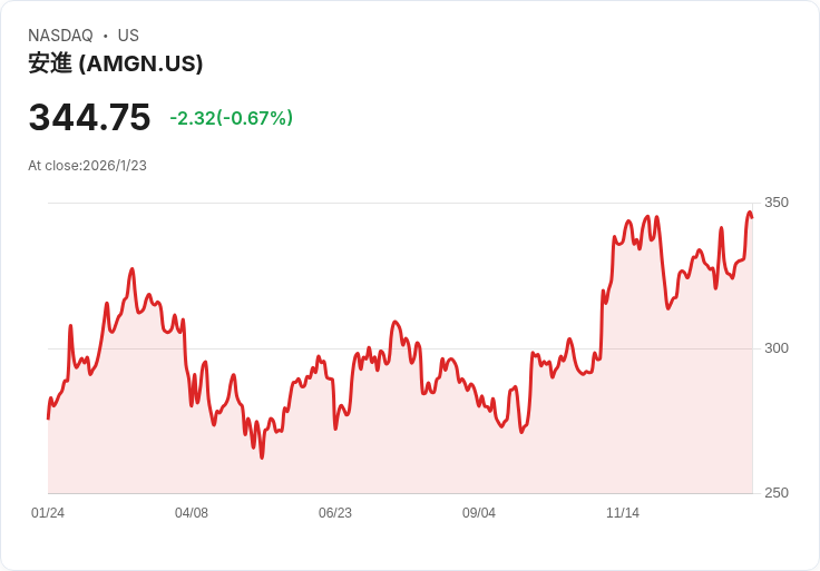 安進(NASDAQ:AMGN)的股價在經歷了六天的穩定增長後,於週五以344.78美元收盤,出現了0.66%的微幅回落。在此之前,該公司股價累計上漲超過7.02%,而標普500指數則下降了0.72%。根據Bernstein研究公司的報告,安進被評為“市場中性”,並預測2026年將是“等待之年”,預估股價可能會維持在335美元附近15%的範圍內。
