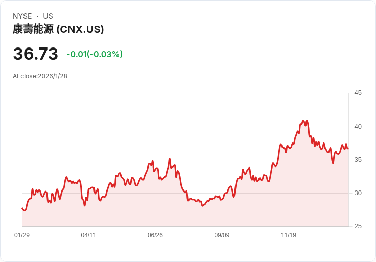 CNX資源公佈第四季財報,每股盈餘及營收均大幅超出市場預期,展望2026年生產量將持平於605至620 Bcfe。