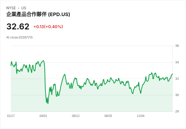 企業產品夥伴(NYSE: EPD)近日表現亮眼,週五收盤時股價上漲0.78%,達到32.88美元,這是該公司連續第七個交易日錄得上漲。作為一家總部位於休士頓的中游能源服務提供商,EPD在過去六個交易日內累計上漲了2.90%,遠高於標準普爾500指數的0.34%增幅。
