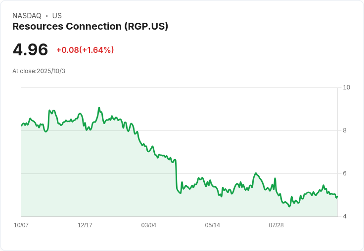 在對資源連線公司(NASDAQ:RGP)進行評估時,使用了兩階段自由現金流模型來預測其未來現金流並將其折現至今日。結果顯示,該公司的公允價值估算為每股6.17美元,而目前的股價僅為4.96美元,表明其交易價格相對合理,但仍有20%的折扣。