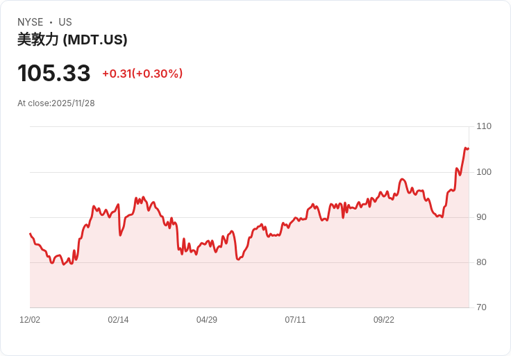 美敦力 plc (NYSE:MDT) 最近發布的財報引起市場關注。11月20日,巴克萊銀行根據該公司強勁的季度表現,將其股價目標從109美元上調至111美元,同時保持「增持」評級。